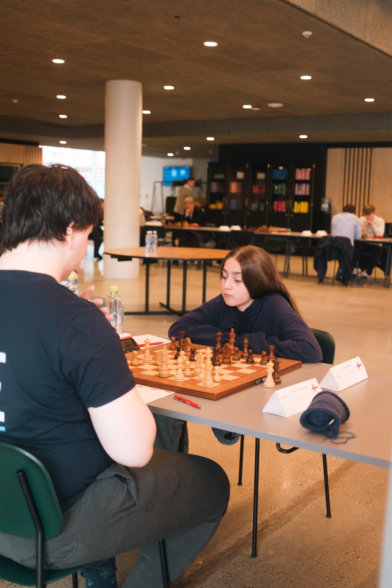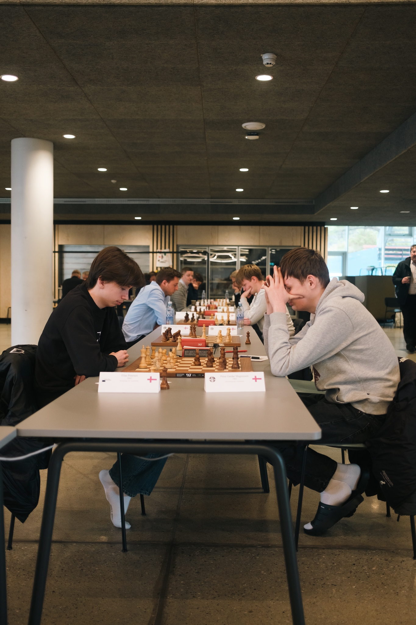 Høgni Egilstoft Nielsen og Martin Poulsen á ovaru borðunum hjá Føroyum í dysti móti Sveis í EM-stevnuni í 2023.