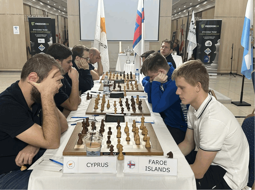 Føroyar móti Kýprós í Larnaca í morgun. Ovast í myndini sæst Helgi Dam Ziska eygleiða gongdina á hinum borðunum. Hann og Jón í Horni Nielsen, fremstur á myndini, vunnu síni talv, og grundaðu soleiðis frálíka føroyska 3 – 1 sigurin í hesum toppdystinum.