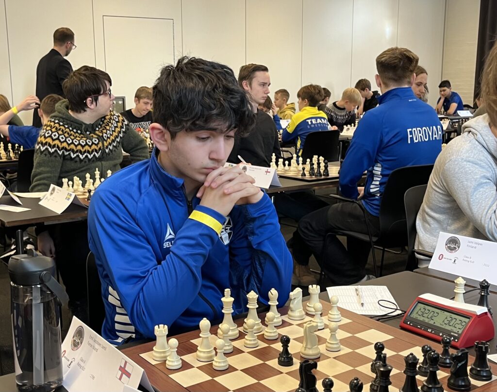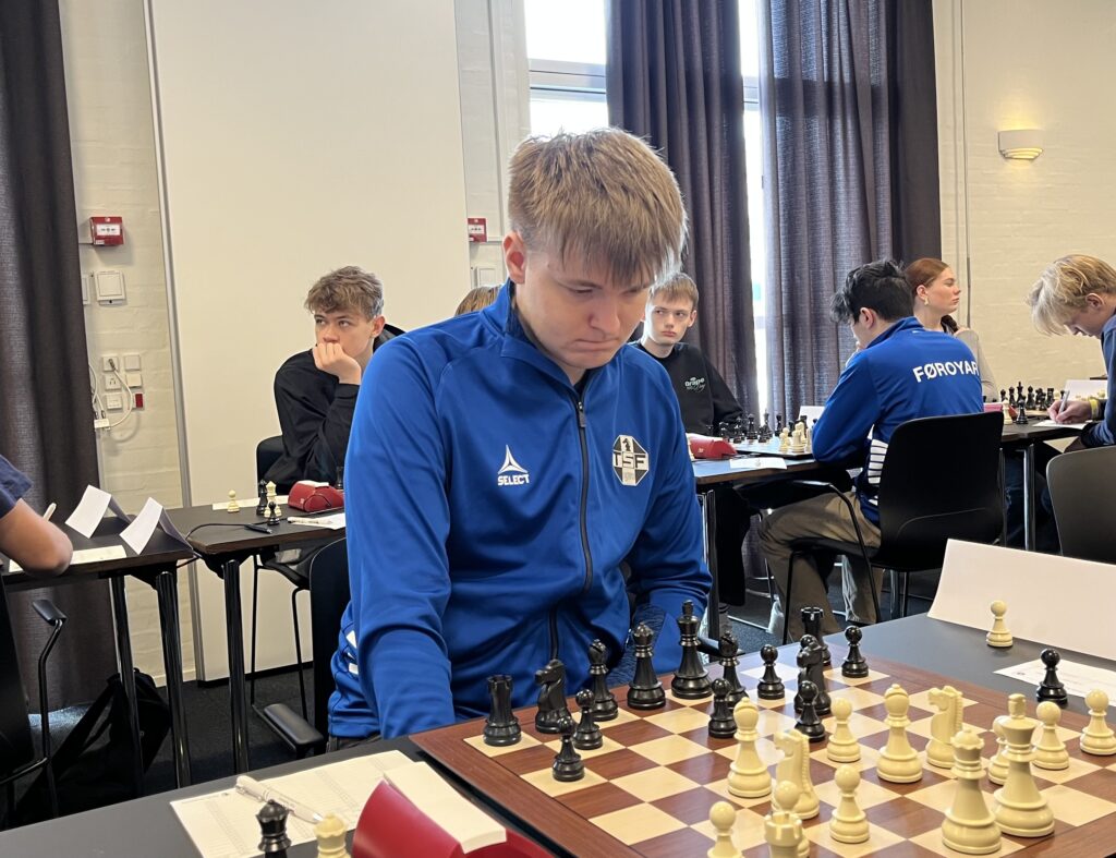 Her skulle de nordiske mesterskaber i skoleskak afholdes. Selve spillet foregik i en mindre sal, og lige udenfor var der en meget stor spisesal og en afdeling med sofaer og borde. Perfekt til en gruppe af supportere. Og supportere havde det færøske hold. Ud over de 10 spillere var der vist 15-16 familiemedlemmer med på turen. Det virkede undertiden som om, at det var lige så mange, som de andre lande havde tilsammen….
