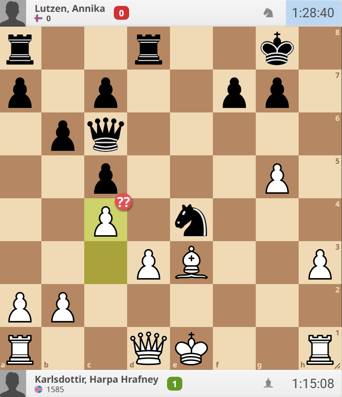 20…Ric3! Bæði frúgvin og rókurin eru í deyða, og má hvítur tí geva rókin fyri riddaran. Næstu 20 leikirnar telvaði Annika væl. Tær komu út í eitt endatalv, sum Annika burdi vunnið. Møguliga manglandi royndirnar spældu inn nú, tí Annika var óansin og lovaði mótstøðugentuni at fáa annan rókin fyri einki. Spell, men avgjørt ein góð byrjar hjá Anniku.