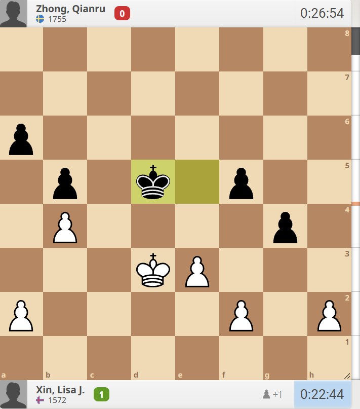 Sjálvt um Lisa burdi vunnið við finnu meira, so er tað ikki so lætt at finna ætlanina, men Lisa fann hana. Talvið endaði soleiðis. 37.f3!, gxf3 38. h4, Ke5 39.Kd2, f4 40.h5, f2 41.exe4, Kxf4 42.Ke2. Mótstøðugentan gavst her.