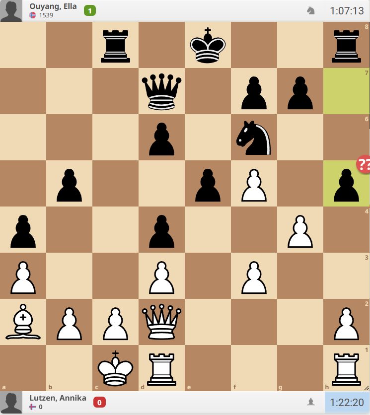 Her hevði Annika møguleika at fingið í minsta lagi býtisfyrimun. Hon skuldi spælt 22. g5!, Rig8 23.g6. Mótstøðugentan kann nú ikki dekka Be6.